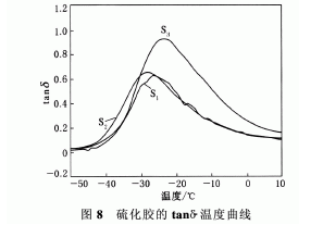 從圖6可以看出,應(yīng)變?yōu)?·51%、頻率低于10 Hz時(shí),硫化膠tanδ值由大到小依次是S1,S2和S3;頻率高于10 Hz時(shí),S3和S1的tanδ相差不大,S2的tanδ最大。