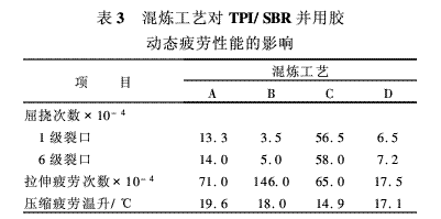 混煉工藝對(duì)TPI/SBR并用膠動(dòng)態(tài)疲勞性能的影響如表3所示。