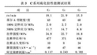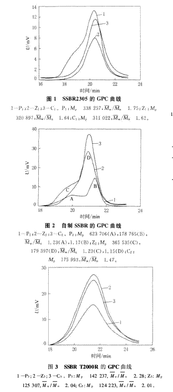 取適量浸泡過混煉膠的甲苯溶劑滴入乙醇溶劑中,萃取出溶解在甲苯中的橡膠,將萃取物烘干后,采用美國Waters公司生產的515-2410型凝膠滲透色譜儀(GPC)進行橡膠相對分子質量測定。