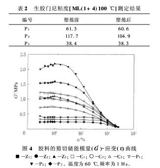 將純膠在Фl60 mm×320 mm開煉機上薄通7次,用北京環(huán)峰化工機械實驗廠生產的MV-C3型門尼粘度儀測試塑煉前后橡膠的門尼粘度值。