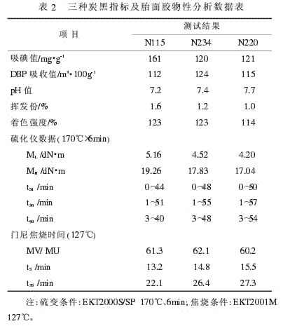 上述配方在其他條件相同時(shí),僅改變炭黑的品種,N115炭黑因其具有很高的比表面積,分散相對(duì)困難,因此將其用量減少5份,而N234與N220炭黑均采用55質(zhì)量份。三種炭黑指標(biāo)及其胎面膠硫變及門尼數(shù)據(jù)見表2。