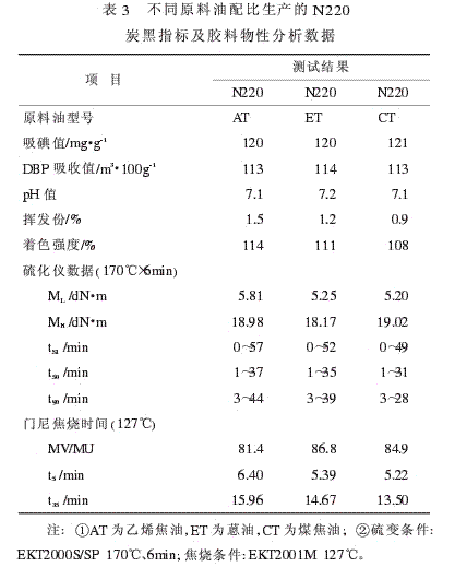 同時(shí)還可以看出,填充用乙烯與蒽油配成混合油生產(chǎn)的N220炭黑的膠料,其焦燒時(shí)間最長(zhǎng),硫化速度最慢,加工安全性最好。