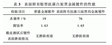由表3可知,在鍍件表面附著抗菌白炭黑對其耐腐蝕性和耐磨性均沒有影響,但抗菌性能卻大大提高。所以,在鍍液中添加抗菌劑可以使鍍件在提高機械性能的同時,具有抗菌性能。