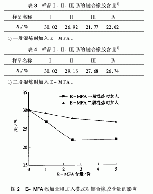 從圖2中可以清楚的看到:E-MFA的加入模式對鍵合橡膠含量的影響較大,一段加入的遠低于二段加入的。E-MFA添加模式對鍵合橡膠含量的影響主要與混煉溫度有關。一段混煉時加入E-MFA,混煉腔溫度略高于120℃,接近E-MFA的熔點,即E-MFA幾乎以液態(tài)形式混煉,本身分散會很均勻。在二段混煉時加入E-MFA,混煉腔溫度控制在略高于80℃。這是因為在制作硫化樣品時,該階段兼具進一步使混料均勻和加入硫化體系進行硫化混煉的作用,溫度太高則會使混煉膠過早硫化,難于排膠和成型。遠低于E-MFA的熔點,E-MFA完全以固態(tài)形式混煉,由于其本身粘性較大,必定團聚嚴重,對炭黑的分散雖略有貢獻,但效果并不明顯。所以,在生產時應采用在一段混煉時加入E-MFA。