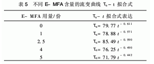 混煉時間的指數(shù)絕對值代表了混煉扭矩對混煉時間的依賴程度[7]。指數(shù)絕對值越大則依賴程度愈大。由表5的指數(shù)值可以看出,隨E-MFA含量的增加,混煉時間指數(shù)的絕對值呈減小的趨勢。說明E-MFA的加入減小了扭矩對時間的依賴性。