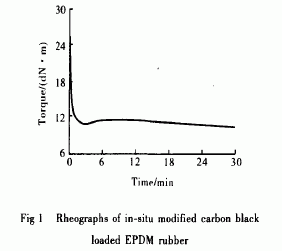 EPD.M炭黑混煉膠的原位改性將一定量EPDM混煉膠置于加工性能測試儀中(轉(zhuǎn)子轉(zhuǎn)速為40 r/min ) ,160℃下處理5 min制得原位改性EPDM炭黑混煉膠。