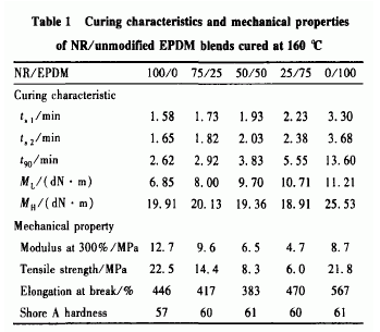 2. 2未改性EPDM炭黑混煉膠與NR共混膠的性能