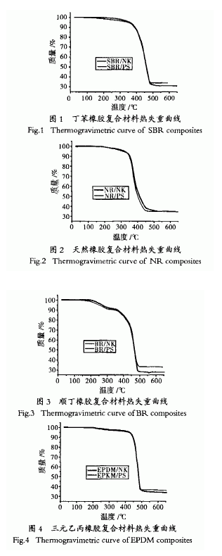 從表4可知,納米高嶺土(NK)比白炭黑(PS)填充的橡膠復(fù)合材料相比,前者耐熱溫度普遍提高了,熱穩(wěn)定性能較好.SBR/NK與SBR/PS相比,開始失重溫度提高了126.75 oC,失重5%、10%、30%、50%的溫度分別提高了9.71、2.28、0.93、0.96℃ ,而顯著失重和穩(wěn)定失重時(shí)的溫度分別提高了3.5℃和55 oC.NR/NK與NR/PS相比,開始失重溫度提高了11.74℃ ,失重5% 、10% 、30% 、50%的溫度分別提高了4.19、2.88、3.91、1 1.84℃,而顯著失重和穩(wěn)定失重時(shí)的溫度分別提高了10 oC和8O℃.BR/NK與BR/PS相比,開始失重溫度提高了85.46℃,失重5% 、10% 、30%的溫度分別提高了l7.82、2O.54、3+2O ,失重50%的溫度下降了0.62℃,兩者基本相當(dāng),而顯著,大重和穩(wěn)定,火重時(shí)的溫度分別提高了1 cc和9O .EPDM/NK與EPDM/PS相比,開始失重溫度提高了3.51 oC,失重5%、10% 、30%的溫度分別提高了6.78、1.29、0.29 ,尖重50%的溫度下降了O.60℃,兩者也基本相當(dāng),而顯著失重和穩(wěn)定失重時(shí)的溫度分別提高了1.2 和50.