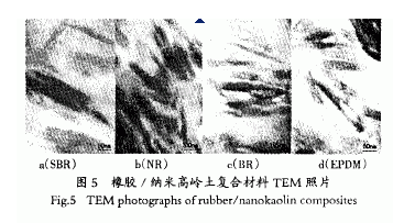 從圖5可知,高嶺石片狀顆粒 4種橡膠復(fù)合材料中絕大多數(shù)呈現(xiàn)次級(jí)結(jié)構(gòu)的片狀定向 行排列,片層厚度均小于100 nm,長(zhǎng)度在300 nm左右.高嶺石的次級(jí)結(jié)構(gòu)片層已被橡膠分子有效的隔離開來,并且與橡膠基質(zhì)界面之間結(jié)合緊密,沒有明顯的孑L隙,這表明改性后的高嶺石片層在橡膠中分散良好,形成了二維高嶺石橡膠納米復(fù)合材料.高嶺石片層的定向平行排列,對(duì)提高復(fù)合材料的拉伸性能、耐熱性能起到了至關(guān)重要的促進(jìn)作用.