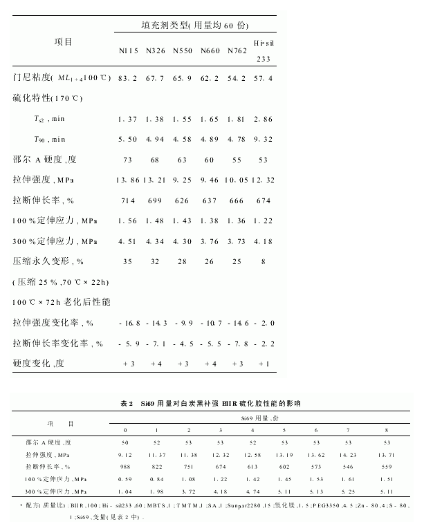 炭黑和白炭黑作為BIIR的補(bǔ)強(qiáng)填充劑,在性能上有著明顯的差別。在實(shí)驗(yàn)過程中,將相同用量(60份)的白炭黑(Hi-sil233)和幾種不同類型的炭黑(N115,N326,N550,N660和N762)分別加入BIIR中,進(jìn)行了對(duì)比實(shí)驗(yàn),結(jié)果見表1。從表1中可以看出,Hi-sil233補(bǔ)強(qiáng)BIIR混煉膠的焦燒時(shí)間(Ts2)長、門尼粘度較低,其加工工藝性能比炭黑補(bǔ)強(qiáng)膠料好。同時(shí),可以發(fā)現(xiàn)Hi-sil233補(bǔ)強(qiáng)BIIR硫化膠的力學(xué)性能不比炭黑補(bǔ)強(qiáng)BIIR的差,但其熱老化性能和壓縮永久變形卻優(yōu)于炭黑補(bǔ)強(qiáng)的BIIR硫化膠。