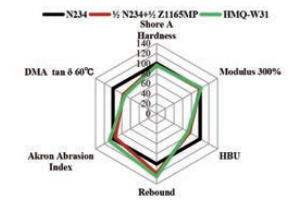 推薦HMQ-W31應(yīng)用于半鋼胎胎面中,有效降低滯后性能的同時(shí)可保持補(bǔ)強(qiáng)性和磨耗性能。