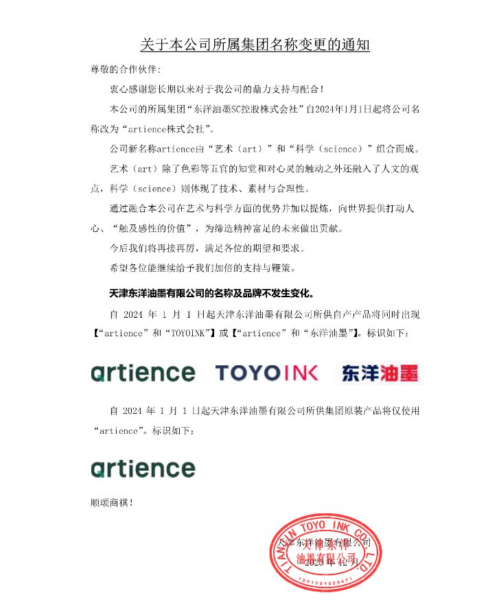 在元旦前夕,東洋油墨旗下的天津東洋油墨有限公司向其合作伙伴發(fā)布了《關(guān)于本公司所屬集團(tuán)名稱變更的通知》,正式宣布了這一重大變革。通知中提到,天津東洋油墨有限公司的名稱及品牌將保持不變,但自2024年起,其生產(chǎn)的產(chǎn)品將同時(shí)展示雙品牌——“artience”與“TOYOINK”或“東洋油墨”。此外,集團(tuán)原裝產(chǎn)品將只使用“artience”品牌。