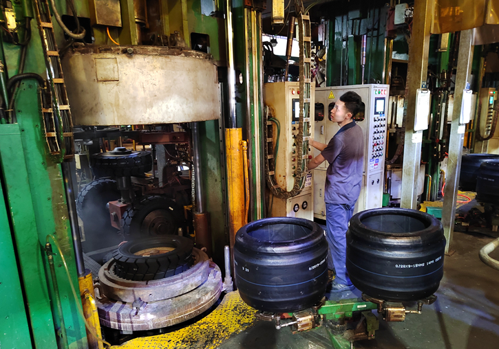 走進硫化車間,只見工人們正在認真操作著設備,對每個輪胎進行最后的加工處理。“硫化是輪胎生產的最后一道工序,對時間、溫度、壓力等指標的把控至關重要?!辟F州輪胎前進特種胎分公司常務副總經理王勇解釋道,經過這道工序后,輪胎將正式成型,待通過公司嚴格的檢驗后便可銷往市場。