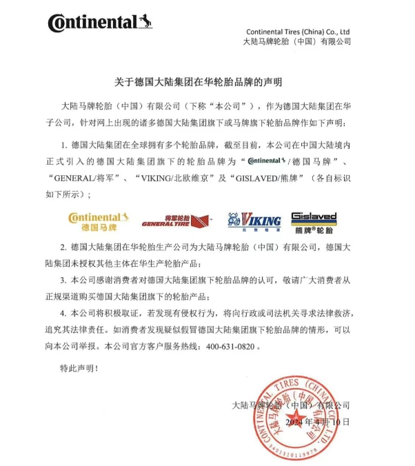 大陸馬牌輪胎中國公司發(fā)布聲明,保障消費者權(quán)益