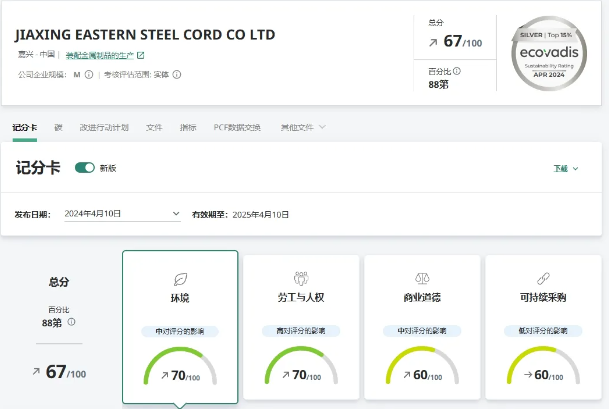 據(jù)悉,EcoVadis認(rèn)證是一個(gè)以企業(yè)社會(huì)責(zé)任標(biāo)準(zhǔn)ISO26000為基礎(chǔ)的全球供應(yīng)商企業(yè)社會(huì)責(zé)任認(rèn)證平臺(tái)。嘉興東方鋼簾線有限公司在今年的認(rèn)證中取得了67分的高分,這充分體現(xiàn)了該公司在可持續(xù)發(fā)展方面的堅(jiān)定承諾和實(shí)踐成果。盡管EcoVadis今年修改了評(píng)估規(guī)則,使得獲獎(jiǎng)難度增加,但嘉興東方依然脫穎而出,榮獲銀牌獎(jiǎng)?wù)?,這無疑是對(duì)其長(zhǎng)期致力于可持續(xù)發(fā)展的有力認(rèn)可。