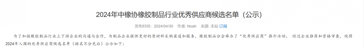中橡協(xié)公示2024年橡膠制品杰出供應(yīng)商
