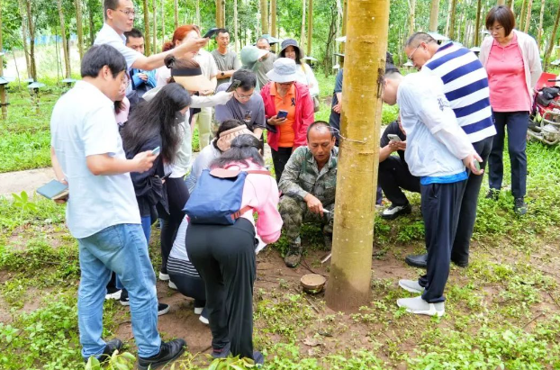 在考察的第一站,考察團(tuán)參觀了農(nóng)墾集團(tuán)的橡膠種植園以及智能化收膠設(shè)施。他們詳細(xì)觀察了橡膠樹的生長與割膠情況,并對原料的品質(zhì)進(jìn)行了嚴(yán)格的評估。這一環(huán)節(jié)主要是為了掌握西雙版納地區(qū)橡膠產(chǎn)業(yè)的真實(shí)現(xiàn)狀,以及種植管理與收膠作業(yè)的具體流程。