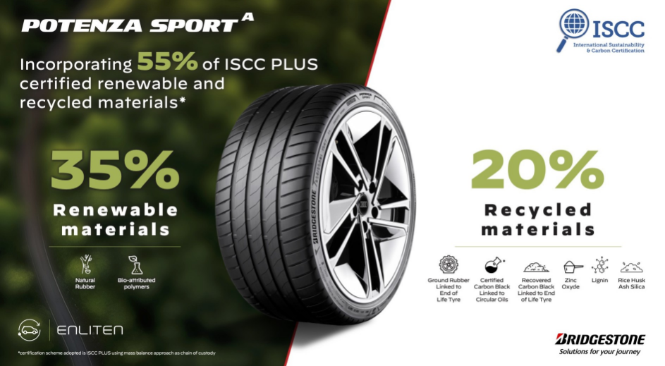 據(jù)悉,Potenza Sport A輪胎在歐洲進行開發(fā),并在普利司通位于羅馬附近的工廠投入生產(chǎn)。值得一提的是,該工廠已通過ISO 50001認證,并且其整個生產(chǎn)過程100%采用來自可再生能源的電力。這款輪胎采用了35%的ISCC+認證的可再生材料,其中包括天然橡膠和生物聚合物,同時,還包含了20%的ISCC+認證的再生材料。這些再生材料來源廣泛,包括報廢輪胎的碎橡膠、循環(huán)油衍生的炭黑、稻殼灰二氧化硅、木質(zhì)素以及基于報廢輪胎的回收炭黑等。