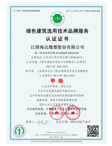 海達橡塑獲得甲級綠色建筑技術品牌服務認證