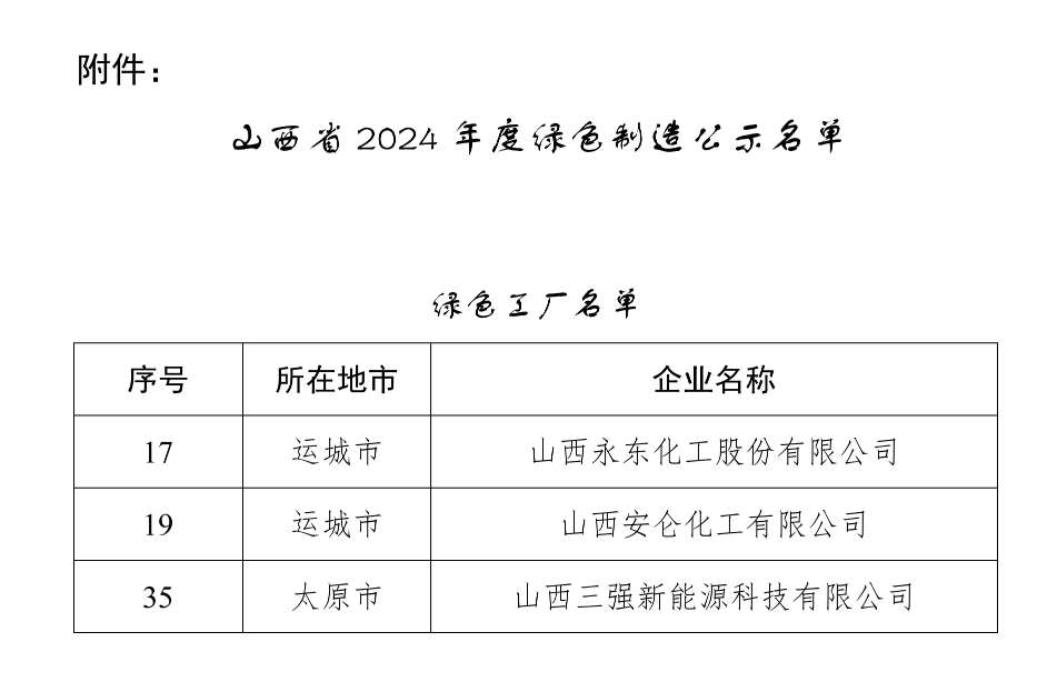 【炭黑產業(yè)網】9月18日消息,山西省工業(yè)和信息化廳近日揭曉了2024年度的省級綠色制造示范企業(yè)榜單,其中,山西永東化工股份有限公司、山西安侖化工有限公司以及山西三強新能源科技有限公司憑借其在綠色生產方面的卓越表現,成功入選綠色工廠示范名單。