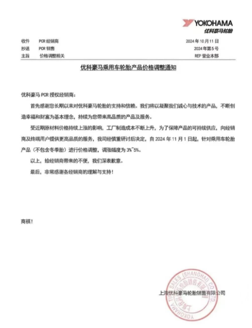【炭黑產(chǎn)業(yè)網(wǎng)】10月19日消息,上海優(yōu)科豪馬輪胎銷售有限公司近日對(duì)外發(fā)布了其乘用車輪胎產(chǎn)品的價(jià)格調(diào)整計(jì)劃,宣布將從11月1日開始,對(duì)除冬季胎外的所有乘用車輪胎產(chǎn)品進(jìn)行價(jià)格上調(diào),調(diào)整幅度預(yù)期在3%至5%之間。此次價(jià)格調(diào)整的通知中明確指出,原材料市場的持續(xù)價(jià)格上漲,直接推動(dòng)了工廠制造成本的不斷提升,是公司決定漲價(jià)的主要因素。