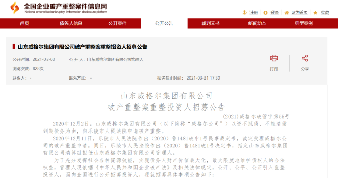 近日,京東資產(chǎn)交易平臺顯示,山東威格爾集團(tuán)有限公司相關(guān)資產(chǎn)正在進(jìn)行破產(chǎn)拍賣。