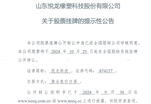 【炭黑產(chǎn)業(yè)網(wǎng)】10月28日消息,山東悅龍橡塑科技股份有限公司(簡稱“悅龍科技”)于10月25日正式在新三板基礎(chǔ)層掛牌,證券代碼為874157,由中泰證券擔任主辦券商。此次掛牌過程中,北京海潤天睿律師事務(wù)所和上會會計師事務(wù)所作為主要中介機構(gòu)發(fā)揮了重要作用。悅龍科技坐落于山東省萊州市,專注于流體輸送柔性管道及軟管總成的研發(fā)、生產(chǎn)和銷售,產(chǎn)品涵蓋海洋工程柔性管道、陸地油氣柔性管道以及工業(yè)專用軟管三大領(lǐng)域。