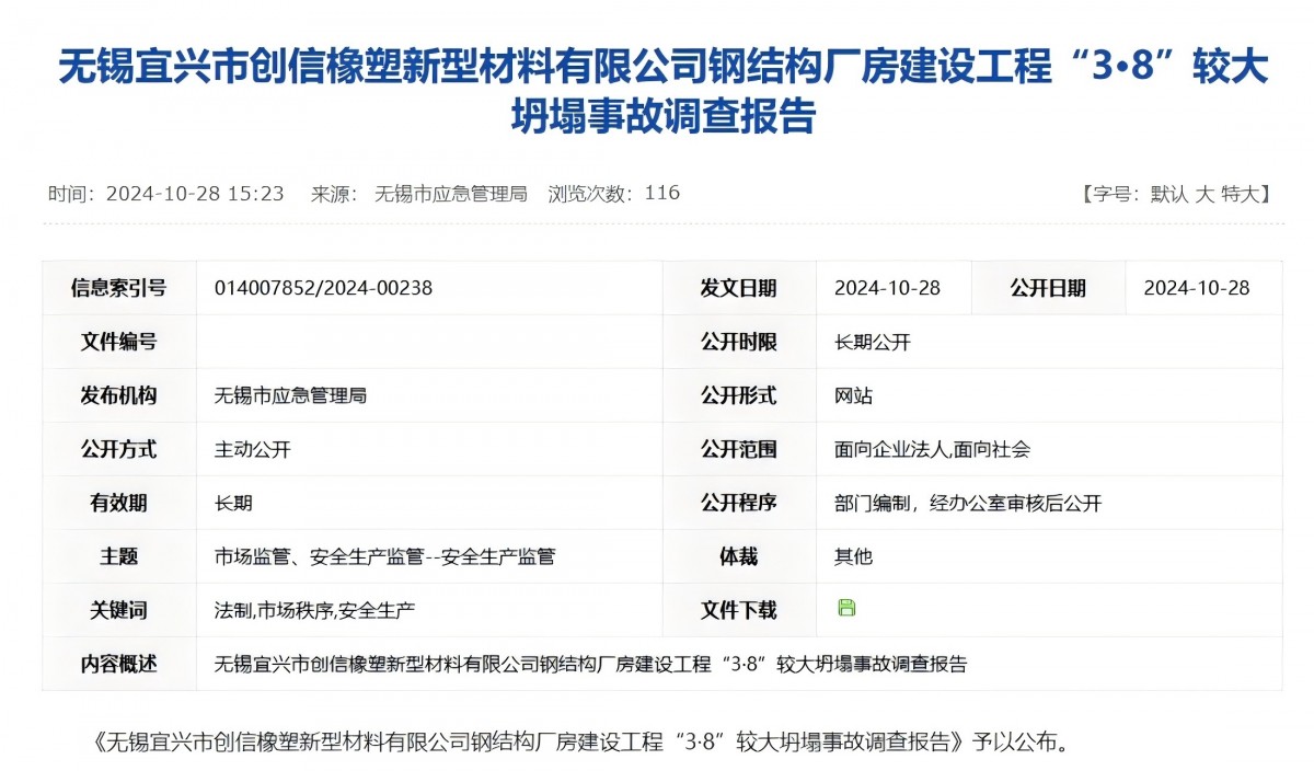 【炭黑產(chǎn)業(yè)網(wǎng)】10月30日消息,無錫市應(yīng)急管理局于10月28日正式發(fā)布了關(guān)于《無錫宜興市創(chuàng)信橡塑新型材料有限公司鋼結(jié)構(gòu)廠房“3·8”重大坍塌事故的調(diào)查報(bào)告》。