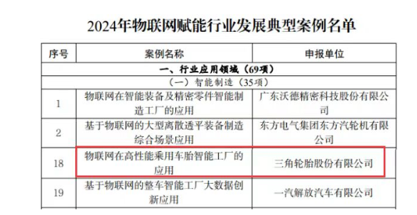 【炭黑產(chǎn)業(yè)網(wǎng)】11月4日消息,近日,國(guó)家工信部公示了2024年物聯(lián)網(wǎng)賦能行業(yè)發(fā)展典型案例,其中智能制造領(lǐng)域共有35個(gè)案例脫穎而出,三角輪胎的“物聯(lián)網(wǎng)在高性能乘用車胎智能工廠的應(yīng)用”項(xiàng)目赫然在列,成為唯一入選的輪胎企業(yè)。