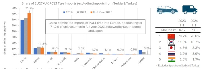 據(jù)歐洲輪胎和橡膠制造商協(xié)會(huì)(ETRMA)最新發(fā)布的報(bào)告顯示,2023年歐洲乘用車和輕卡輪胎進(jìn)口總量增長2%;中國進(jìn)口份額顯著增加,來自中國的低成本輕卡輪胎持續(xù)獲得顯著份額,從2019年占進(jìn)口量的59%增長至2023年全年的71.2%。2022年和2023年,來自中國的輪胎進(jìn)口量均增加了超過1000萬條,截至2023年底,比2015年增加了超過4000萬條。