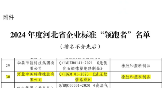 河北中美特種橡膠榮膺省級企業(yè)標準“領跑者”