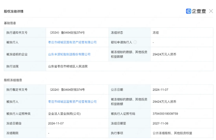 企查查信息顯示,此次豐源輪胎股權(quán)被凍結(jié)被執(zhí)行人為二股東山東嶧州國(guó)有資產(chǎn)管理運(yùn)營(yíng)集團(tuán)有限公司(下稱“嶧州國(guó)資集團(tuán)”),其持有的29424萬(wàn)元股權(quán)被全部?jī)鼋Y(jié)。
