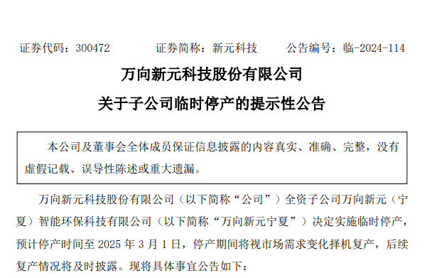 【炭黑產(chǎn)業(yè)網(wǎng)】12月5日消息,萬向新元科技股份有限公司(以下簡稱“萬向新元”)近日宣布,其全資子公司萬向新元(寧夏)智能環(huán)??萍加邢薰?簡稱“萬向新元寧夏”)將啟動臨時停產(chǎn)計劃,預計此狀態(tài)將持續(xù)至2025年3月1日,停產(chǎn)期間將視市場需求變化擇機復產(chǎn)。