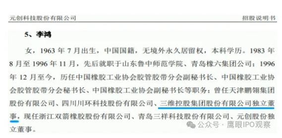 招股書披露,李鴻現(xiàn)任元創(chuàng)股份獨立董事,同時還擔(dān)任浙江雙箭橡膠股份有限公司、青島三祥科技股份有限公司的獨立董事;其還曾任天津鵬翎集團(tuán)股份有限公司、四川川環(huán)科技股份有限公司、三維控股集團(tuán)股份有限公司(簡稱“三維控股”)等企業(yè)的獨立董事。
