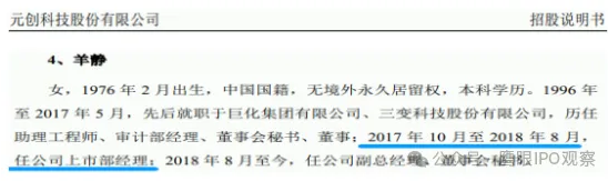 招股書披露,羊靜于1996年至2017年5月先后就職于巨化集團(tuán)有限公司、三變科技股份有限公司(簡稱“三變科技”);2017年10月至2018年8月,任元創(chuàng)股份上市部經(jīng)理;2018年8月至今,任公司副總經(jīng)理、董事會秘書。