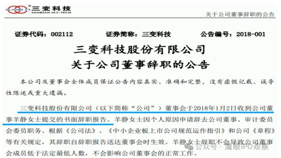 但據(jù)三變科技的公告披露,羊靜在2018年1月2日才向該公司提交辭呈,比其入職元創(chuàng)股份的時間晚了兩個月。