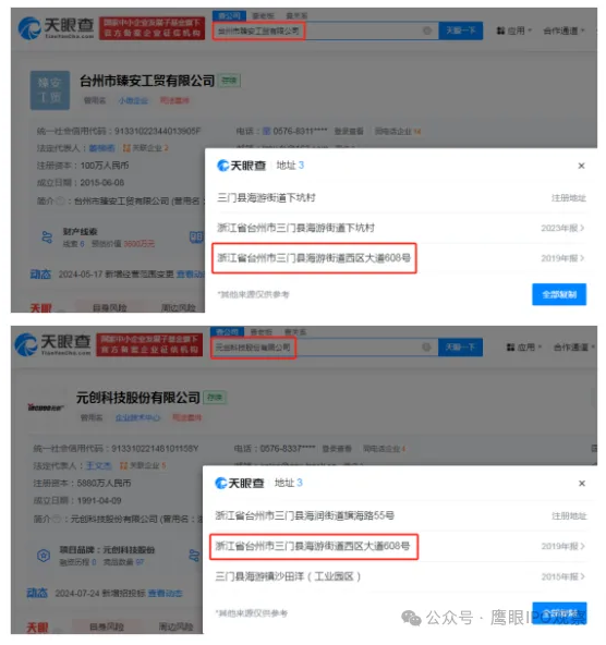 工商資料還顯示,2016年至2024年5月,臻安工貿(mào)的法人為元創(chuàng)股份的實際控制人之一王大元,聯(lián)系人為元創(chuàng)股份的監(jiān)事會主席王永躍。而據(jù)臻安工貿(mào)2019年年報顯示,該公司的注冊地址為“浙江省臺州市三門縣海游街道西區(qū)大道608號”,該地址同為元創(chuàng)股份2019年年報披露的注冊地址。