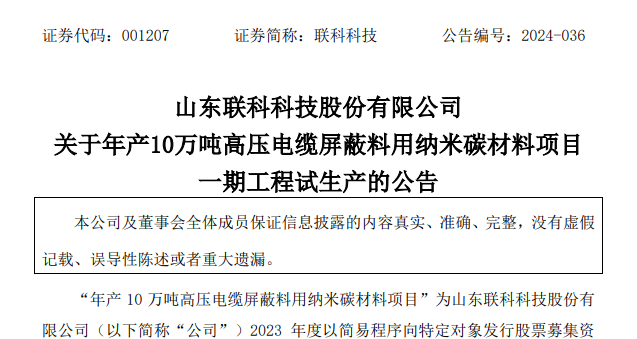 6月—— 聯(lián)科科技控股子公司“年產(chǎn)10萬噸高壓電纜屏蔽料用納米碳材料項目”一期工程建設(shè)完成進(jìn)入試生產(chǎn)階段。該項目屬于2023年山東省重大實施類項目,旨在實現(xiàn)導(dǎo)電炭黑國產(chǎn)化生產(chǎn)。