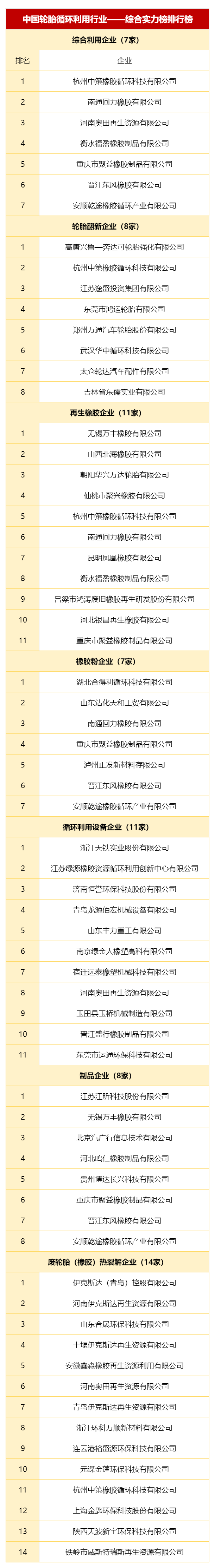 活動(dòng)公布了綜合實(shí)力排行榜,細(xì)分為綜合利用、輪胎翻新、再生橡膠、橡膠粉、循環(huán)制品、廢輪胎(橡膠)熱裂解和循環(huán)利用設(shè)備,共七個(gè)領(lǐng)域。