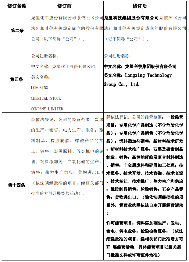 【炭黑產(chǎn)業(yè)網(wǎng)】12月31日消息,龍星化工股份有限公司發(fā)布公告,宣布計(jì)劃進(jìn)行一系列重大變更,包括公司名稱、證券簡(jiǎn)稱的調(diào)整,以及經(jīng)營(yíng)范圍的擴(kuò)大和《公司章程》的修訂。