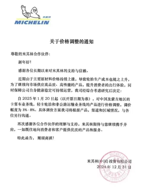 【炭黑產(chǎn)業(yè)網(wǎng)】1月2日消息,全球輪胎行業(yè)的領軍者米其林(中國)投資有限公司近日發(fā)出了一則重要的價格調(diào)整通知,震動了輪胎市場。