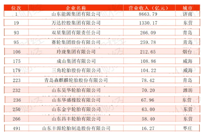 值得注意的是,山東作為輪胎產業(yè)的大省,本次榜單中有13家輪胎制造企業(yè)及其母公司榮耀上榜。這些企業(yè)涵蓋了山東能源集團、萬達控股等涉足橡膠輪胎板塊的集團企業(yè),以及華勤橡膠、雙星集團、賽輪集團、玲瓏集團、成山集團、三角輪胎等以輪胎制造為主業(yè)的企業(yè)。據炭黑產業(yè)網了解,這些輪胎企業(yè)在業(yè)內享有盛譽,其產品質量和市場份額均處于行業(yè)領先地位。