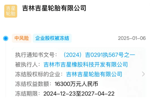 吉林吉星輪胎有限公司,面臨重大法律和財務(wù)挑戰(zhàn)。2025年1月6日,據(jù)最新消息,吉林吉星輪胎有限公司的股權(quán)已被凍結(jié),涉及金額高達1.63億元人民幣。