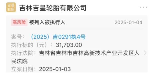 2025年1月4日,吉林吉星輪胎有限公司因涉及執(zhí)行標的達31703元的案件,已被列入被執(zhí)行人高風(fēng)險名單。