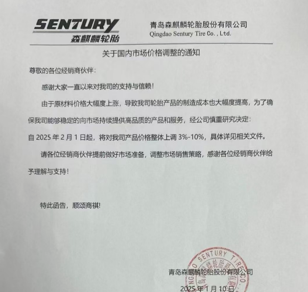 【炭黑產(chǎn)業(yè)網(wǎng)】1月13日消息,近日,青島森麒麟輪胎股份有限公司向其全國經(jīng)銷商發(fā)布了一則關(guān)于產(chǎn)品價(jià)格調(diào)整的通知。據(jù)了解,由于近期原材料價(jià)格的大幅上漲,該公司輪胎產(chǎn)品的生產(chǎn)成本也隨之顯著增加。為了保障公司能夠持續(xù)穩(wěn)定地向市場提供高品質(zhì)的產(chǎn)品和服務(wù),青島森麒麟輪胎股份有限公司經(jīng)過慎重考慮,決定自2025年2月1日起,對旗下輪胎產(chǎn)品的價(jià)格進(jìn)行全面上調(diào),調(diào)整幅度在3%至10%之間。