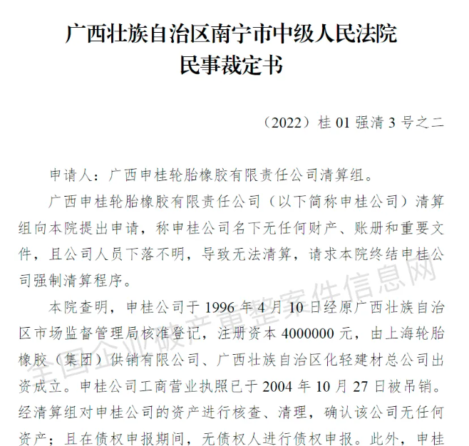 申桂公司,這個(gè)1996年由上海輪胎橡膠(集團(tuán))供銷(xiāo)有限公司與廣西壯族自治區(qū)化輕建材總公司攜手創(chuàng)立的企業(yè),注冊(cè)資本達(dá)400萬(wàn)元人民幣,曾一度被寄予厚望。然而,自2004年起,公司便步入困境,工商營(yíng)業(yè)執(zhí)照遭吊銷(xiāo),盡管之后歷經(jīng)多年努力,卻終究未能扭轉(zhuǎn)乾坤。法院最終裁定,因申桂公司名下已無(wú)任何財(cái)產(chǎn)、賬冊(cè)及重要文件,且公司人員失去聯(lián)系,清算工作無(wú)法繼續(xù)推進(jìn),同時(shí)在債權(quán)申報(bào)期內(nèi)未有債權(quán)人提出申報(bào),故申桂公司清算程序正式終結(jié)。