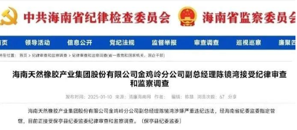 1月10日,海南天然橡膠產(chǎn)業(yè)集團股份有限公司金雞嶺分公司副總經(jīng)理陳鏡灣涉嫌嚴重違紀(jì)違法,經(jīng)海南省紀(jì)委監(jiān)委指定管轄,目前正接受海南省保亭縣紀(jì)委監(jiān)委紀(jì)律審查和監(jiān)察調(diào)查。