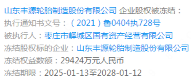 豐源輪胎的股權(quán)近期頻遭司法凍結(jié)。工商登記資料顯示,豐源輪胎由棗莊礦業(yè)集團(tuán)有限責(zé)任公司(持股60.50%)、嶧州國(guó)資集團(tuán)(持股25.58%)和豐源集團(tuán)(持股13.92%)共同持股。