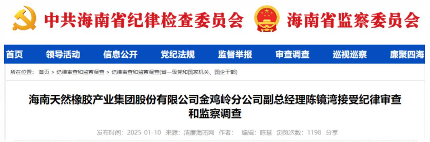 海南橡膠副總陳鏡灣涉嫌違紀(jì)被查