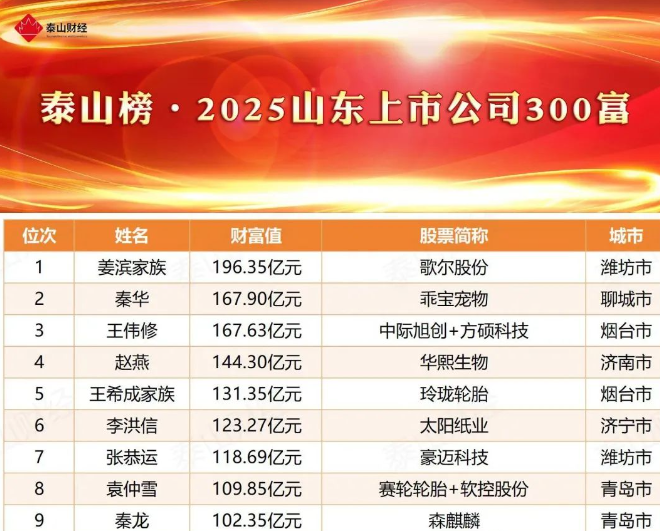 【炭黑產(chǎn)業(yè)網(wǎng)】2月6日消息,山東輪胎行業(yè)再度迎來榮耀時刻,《泰山榜·2025山東上市公司300富》榜單揭曉,輪胎界的精英們紛紛嶄露頭角。其中,玲瓏輪胎的王希成家族、賽輪輪胎的掌舵人袁仲雪,以及森麒麟的領(lǐng)軍者秦龍,均以超越百億的財(cái)富彰顯了山東輪胎業(yè)的非凡實(shí)力與市場號召力。
